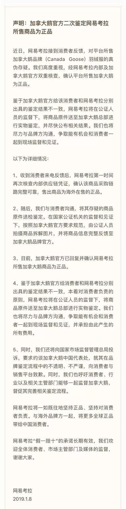 1月8日,网易考拉发布声明称,已向加拿大鹅官方邮件二次鉴定,将同一件羽绒服鉴定为正品。