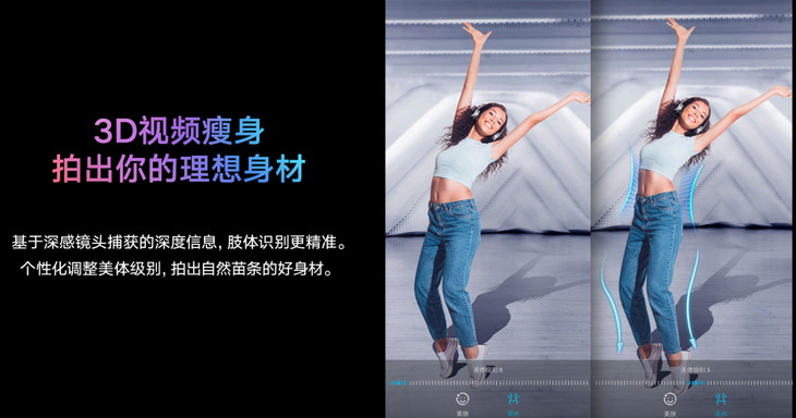 有了ToF,荣耀V20还可以做许多其他的事情,例如3D视频瘦身。ToF镜头捕捉到准确的三维信息后,就可以通过处理器实时对画面进行准确的处理加工,让你得到一个满意的身材。除了3D瘦身,YOYO炫舞也是荣耀V20的独特功能,通过ToF捕捉你的动作来让YOYO的AR虚拟形象与你一起舞动。