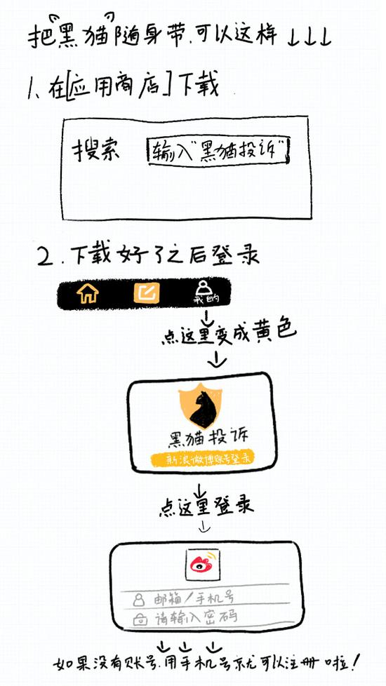 1、下载、注册、登录,全不会?让我来手把手教您吧:应用商店搜“黑猫投诉”,使用微博账号登录,或用手机号码注册。