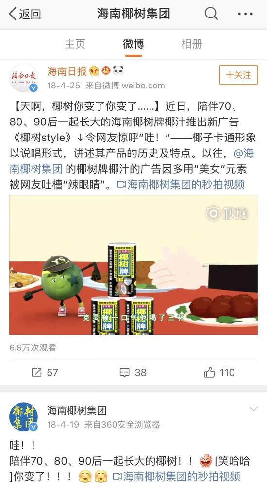 图为海南椰树集团官方微博截图。虽声称已经改变,但在包装上并没有改变以往的“美女”元素。