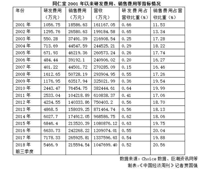 除了质量安全问题,《中国经济周刊》记者统计发现,自2001年至2018年前三季度,同仁堂在研发投入方面较为薄弱,研发费用占营收比重一直保持在较低水平。
