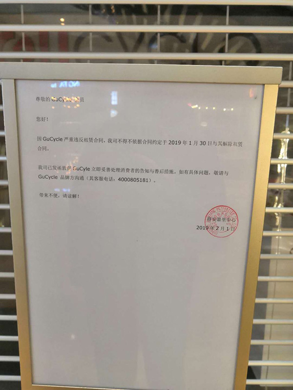 2019年2月1日,GuCycle南京西路店被物业关停,门口的公告上写明“因GuCycle严重违反租赁合同,我司不得不依据合同约定于1月30日与其解除租赁合同……”