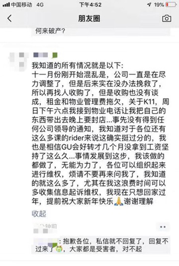 与此同时,会员们也试图向工作人员取得联系,但电话已无人接听。一位GuCycle前员工在朋友圈发文称“公司从十一月份开始混乱,后来实在没法挽救了,所以在找人收购了,但是收购也没有谈成,租金和物业管理费拖欠……”这位工作人员表示,自己事先没有得到任何通知,她们也是受害者。