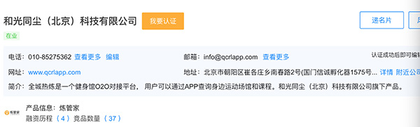 这家和光同尘(北京)科技有限公司在天眼查上的简介为:全城热炼是一个健身馆O2O对接平台, 用户可以通过APP查询身边运动场馆和课程。和光同尘(北京)科技有限公司旗下产品。