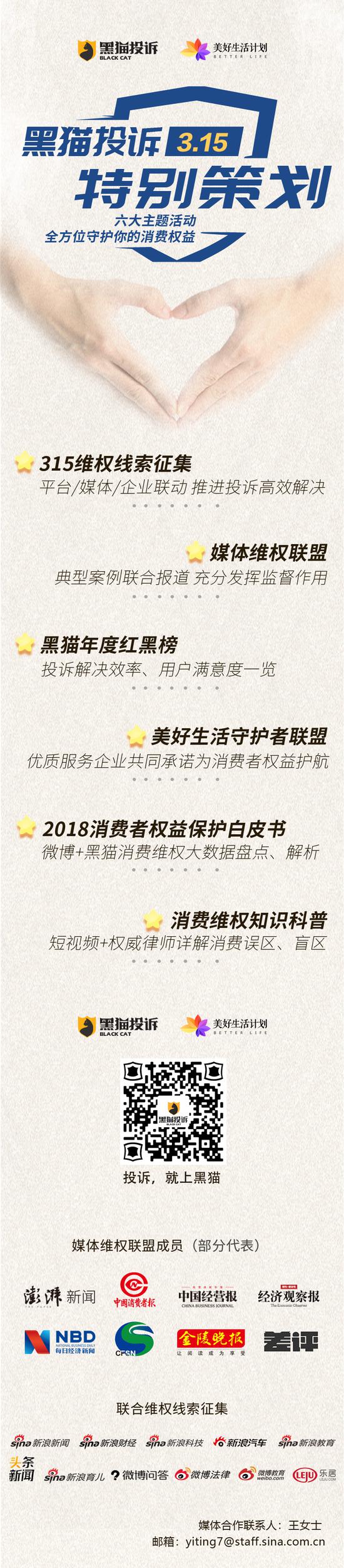 黑猫将面向社会征集各类消费维权线索,如果你遭遇过或正在遭遇消费维权难题,自己的合法权益遭受了损害,都可以登录黑猫投诉官网 或下载黑猫投诉客户端进行投诉,官方核实后会联合新浪网各垂直频道进行专题报道、合作媒体进行全面追踪报道,并对接商家,共同帮消费者推动投诉顺利解决。