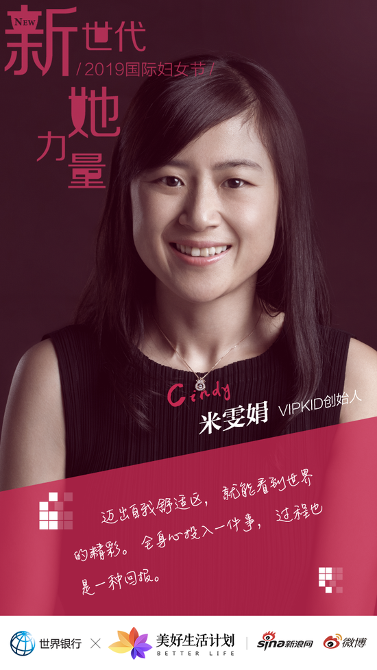 [导读]在2019国际妇女节到来之际,“美好生活计划”携手世界银行,推出特别策划【新世代,她力量】,为大家带来VIPKID创始人米雯娟、快看漫画创始人陈安妮、轻松筹创始人兼CEO杨胤等多位中国女性鼓舞人心的故事。对话VIPKID米雯娟Q:请自我介绍一下。Tellusaboutyourself.A:我是米雯娟,是一位在线教育行业的创业者。