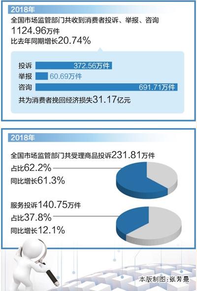[导读]2018年消费者投诉举报处理情况分析报告显示升级类消费投诉迅猛增长人民日报辛萱2018年,全国市场监管部门共收到消费者投诉、举报、咨询1124 96万件,比去年同期增长20 74%。其中,投诉372 56万件,举报60 69万件,咨询691 71万件,共为消费者挽回经济损失31 17亿元。主要呈现八大特点:商品投诉比重扩大2018年,全国市场监管部门共受理商品投诉231 81万件,占比62 2%,同比增长61 3%,服务投诉140 75万件,占比37 8%,同比增长12