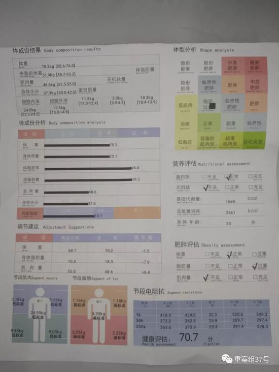 ▲北京东城区一家健身房向记者出示的人体成分分析报告。