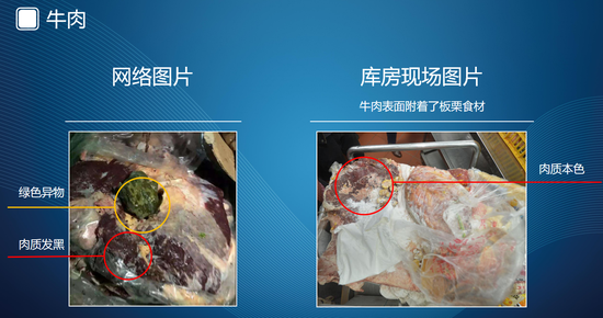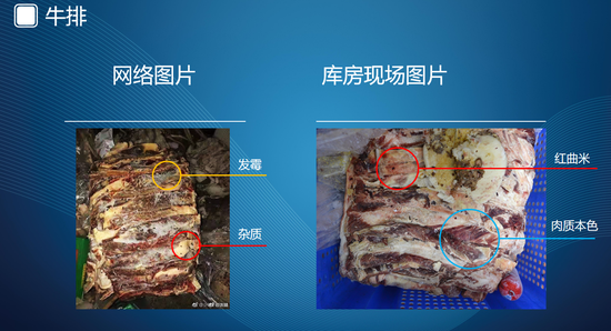 第二组是牛排照片。左边是网络流传的所谓发霉、有杂质的牛排照片;右边是拍摄于学校冻库的牛排照片。可以看到,右边照片清楚显示,牛排表面没有发霉,所谓“杂质”实际上是红曲米。右上角的白色物为肉夹馍。