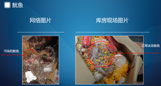 第四组是鱿鱼照片。左边是网络流传的污染了的鱿鱼照片;右边照片是冰冻鱿鱼的色泽正常,其上附着的黄色、绿色物为玉米、豌豆、火腿肠等其它食材。