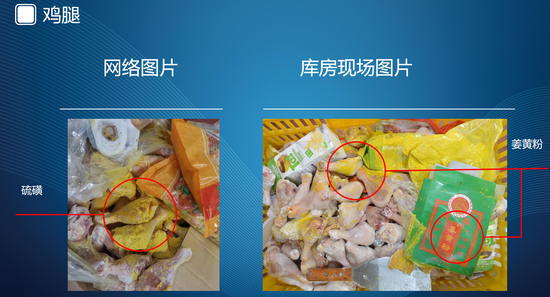 第三组是鸡腿照片。左边照片是网络流传的使用了硫磺的鸡腿;右边照片清楚显示,鸡腿表面的黄色粉末实际上是姜黄粉,根本不是硫磺。