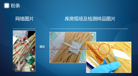 第六组是粉条照片。左边是网络流传的有霉斑的粉条照片;右边是库房及检测机构实验室拍摄的粉条照片。经专家和四川源坤国科质量检验有限公司检测人员鉴定,粉条表面有肉眼可见的霉斑,检验结果为不合格。