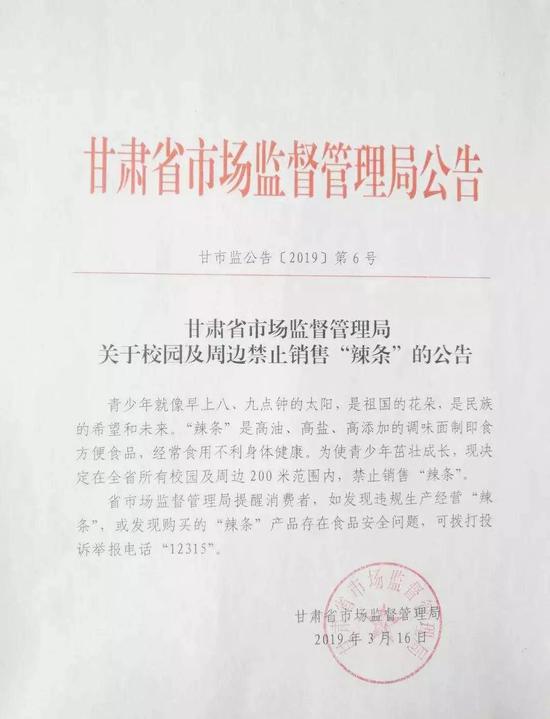 甘肃省市场监督管理局关于校园及周边禁止销售“辣条”的公告