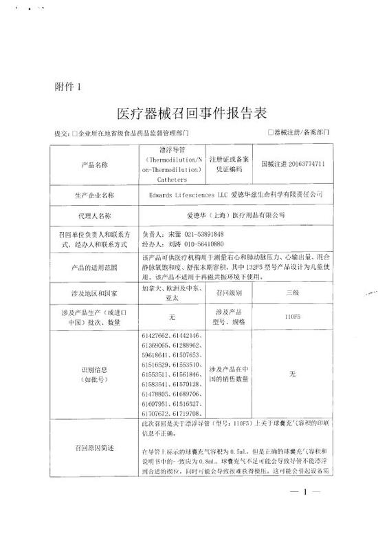 爱德华(上海)医疗用品有限公司报告,由于涉及产品球囊充气容积的印刷信息不正确问题,Edwards Lifesciences LLC爱德华兹生命科学有限责任公司对其生产的漂浮导管(注册证号:国械注进20163774711)主动召回。召回级别为三级。涉及产品的名称、注册证或备案凭证编码、型号、规格及批次等详细信息见《医疗器械召回事件报告表》。