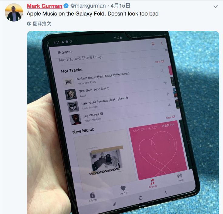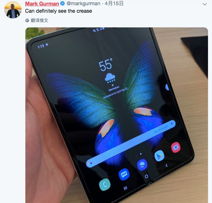 4月15日,Mark Gurman拿到了这款手机,虽然两块屏幕中间的折痕比较明显,但用起来还算不错。