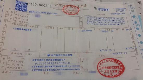 将自己的遭遇和这件热点事件对比后,刘先生还发现,自己也被收了金融服务费。“我当时想全款购车,销售说贷款能有优惠,引导我贷款,收了5856元的金融服务费。”刘先生向记者展示了一张发票,“货物或应税劳务、服务名称”上明确写着金融服务费。现在,刘先生也希望4S店能退还金融服务费。