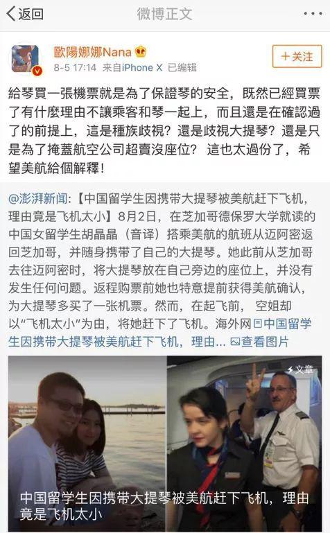 这件事被发到网上之后,欧阳娜娜为这名留学生发声支持,怒怼美航,称这究竟是种族歧视还是对大提琴的歧视?