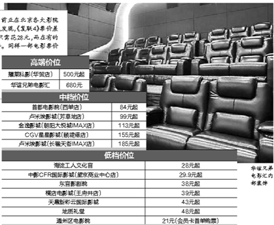在调查中北青报记者发现了一个有趣的现象是,同一品牌的影院价格差距也非常大。以耀莱为例,耀莱成龙国际影城(丽泽桥店),昨天上午11:00的票价为34元;耀莱成龙影城(王府井店),激光厅票价为45元起;耀莱成龙国际影城(慈云寺店),票价为109元起;而耀莱私影(华贸店)杜比全景声厅,票价为500元起。