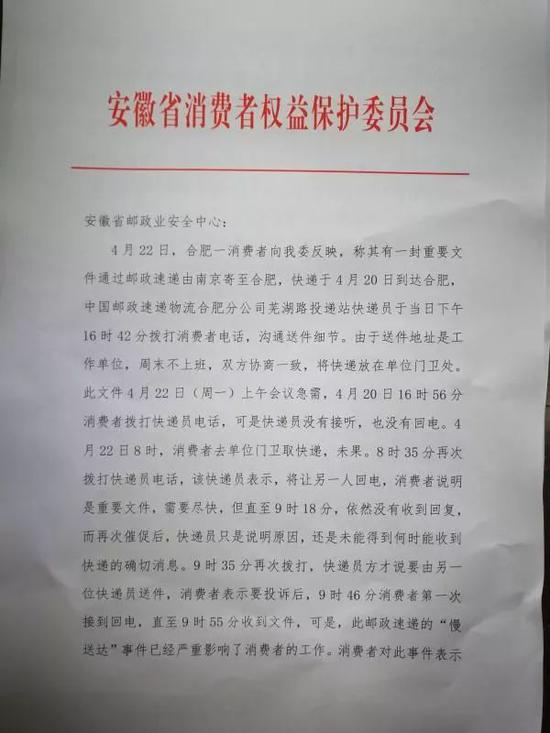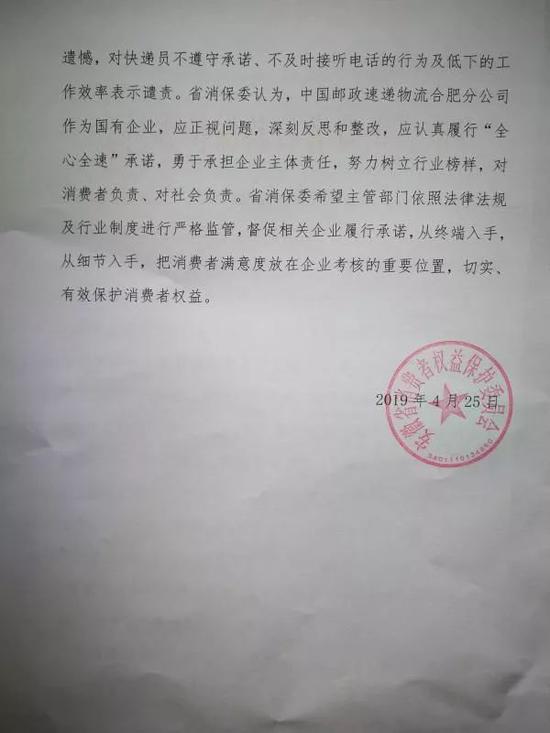 4月26日,邮政速递合肥公司给安徽省消保委送达了《关于我公司芜湖路营业部邮件投递延误整改处理的回复函》。