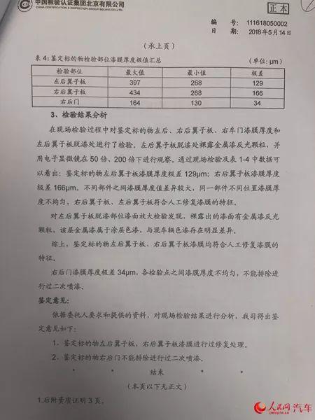 郑女士向记者提供了中国检验认证集团北京有限公司出具的《鉴定意见书(对玛莎拉蒂轿车漆膜进行鉴定)》。中国检验认证集团北京有限公司是以“检验、鉴定、认证、测试”为主业的独立第三方检验认证机构,于2009年入选最高人民法院司法技术专业机构名册,为最高法对外委托司法技术工作随机选择对象。