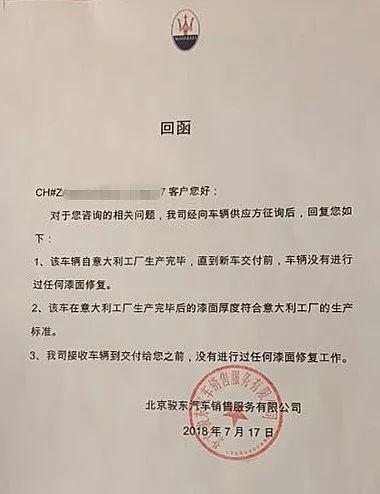 另一份书面回函于今年1月18日出具,同样由骏东公司盖章落款。回函中写到,玛莎拉蒂(中国)汽车贸易有限公司回复,该车自意大利工厂生产完毕,直到该公司PDI流程结束,于2017年9月25日交付给经销商,该车没有进行过任何漆面修复。经向意大利车厂查询,该车全车喷漆后,喷涂工艺检验人员检查发现车身的油漆表面未达到理想状态,因此对该车的车身进行了二次喷漆。由于车门油漆状态符合标准,因此未进行二次喷漆,也因此造成车身油漆厚度与车门油漆厚度不一致,以上操作均符合玛莎拉蒂生产管理标准。