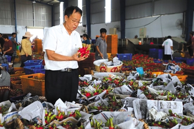 走进北京新发地进口水果交易区,各式水果让人眼花缭乱。要看样品,可以直接进冷库,泰国的山竹、榴莲、龙眼,越南的红毛丹、火龙果,巴基斯坦的芒果,以色列的石榴……商户坐在冷库前开票,零星小件批发直接从库里提货,大批量走货则直接从停在交易区内的大货柜里卸货。