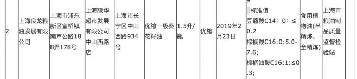 另批次不合格样品为:上海联华超市发展有限公司中山西路店销售的标称上海良龙粮油发展有限公司生产的优飨一级葵花籽油。