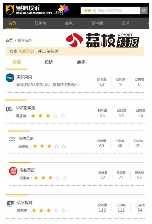 那么,这种情况只存在于韦博英语吗?江苏新闻广播记者在新浪旗下消费者服务平台—— “ 黑猫投诉 ” 上看到,关于教育培训机构的投诉不在少数,美联英语 12 件、华尔街英语 54 件、韦博英语 59 件、洛基英语 77 件,数量最高的是英孚教育 109 件,主要投诉集中在,“ 套路 ” 贷款、培训贷、退费难、退费霸王条款等。