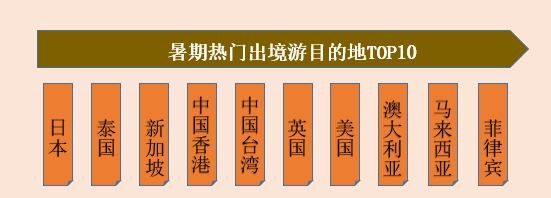 事实上,不仅仅是在国内度夏避暑,越来越多人选择出境游,去看更大的世界。那么,暑期出国旅游去哪儿?通过《报告》分析,日本、泰国、新加坡、中国香港、中国台湾、英国、美国、马来西亚、澳大利亚、菲律宾是十大高人气目的地。