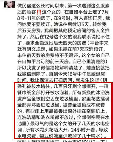 [导读]原标题:女住客因无法退订报复民宿浪费几十吨水回应:不觉有错来源:荔枝新闻网近日,成都一民宿老板陈阳(化名)在网上发帖称遇到一位“没素质”的房客,因退款纠纷问题未解决,该房客在退房前损毁了房内大量物品,连续几天24小时无间断水电全开,造成严重浪费。陈阳介绍说,一位名叫王可(化名)的房客曾在某民宿平台上预定了7月8日-7月11日自家的民宿房间。
