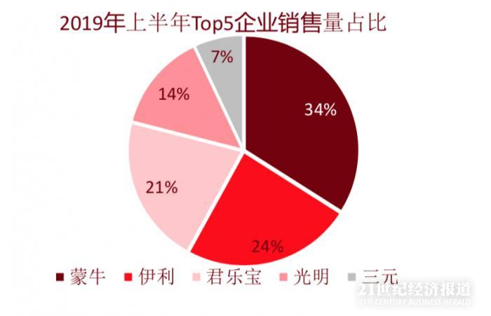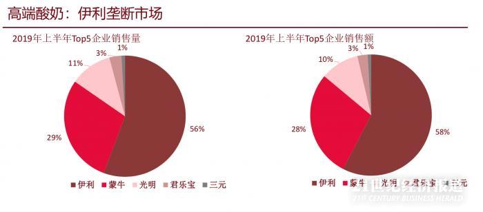 上半年,蒙牛、伊利、君乐宝稳居大众酸奶前三甲。在大众酸奶市场中,蒙牛占整个市场的三分之一市场份额,领导地位明显,伊利、君乐宝紧随其后。2019年上半年,君乐宝销售额出现了逆势上涨的现象。大众酸奶基本为低温酸奶,由于冷链技术的原因,南部地区市场和北部地区龙头企业差异较大。君乐宝在北部地区市场处于领导地位,并保持稳定的增长趋势,而南部地区市场变化较大,整体呈现出下滑趋势。自2018年下半年起光明失去了在南部地区市场的领先地位,被蒙牛反超。