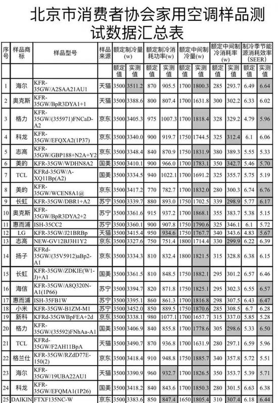 7月24日,北京市消协发布家用空调比较试验结果。本次比较试验主要进行制冷季节能源消耗效率(SEER)的测试。在被测试的所有样品均有指标实测值未达到或超过额定值,奥克斯、新科和TCL的样品所有检测项目均表现不佳。北京市消协表示,虽然样品实测值未超出国家规定的误差范围,但对消费者选择低能耗产品还是有不利的影响。