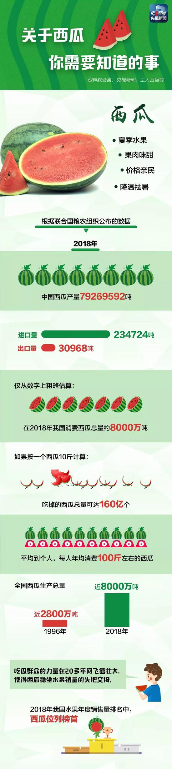 [导读]一年吃掉16000000000个西瓜,“吃瓜群众”知道如何挑瓜吗?大暑已至,闷热难耐的天气来了。从冰箱里捧出半个冰镇西瓜,挖出中间最甜的那一块;打开空调,窝在沙发里吸上一口冰镇西瓜汁。快乐,就是这么简单。在中国,西瓜是夏季水果里王者般的存在。根据联合国粮农组织公布的数据,2018年中国西瓜产量超过7900万吨,中国也是世界上最大的西瓜生产国和消费国。“吃瓜群众”们对西瓜究竟有多迷恋?挑瓜、吃瓜有哪些小秘诀?