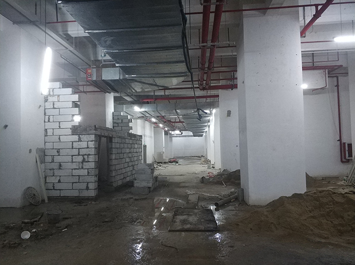 而在负二楼的地下车库,还有未完工的瓷砖、水泥、沙子、木板等材料堆积在潮湿的地面上。在车库四周的消防设备不齐全;电梯楼、过道的墙面上随处可见裸露的电线头;里面上仍是施工后留下的水泥污渍等。