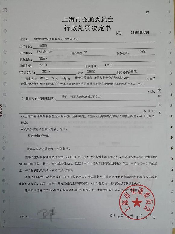 市交通委执法总队对“滴滴出行”开具行政处罚决定书↑