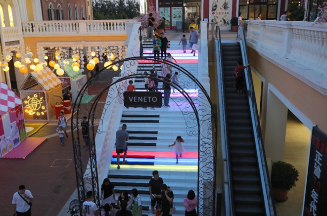 天津首个户外炫光钢琴音乐楼梯,装置融合光影效果,通过与消费感官互动接触,提供更丰富体验增值服务。