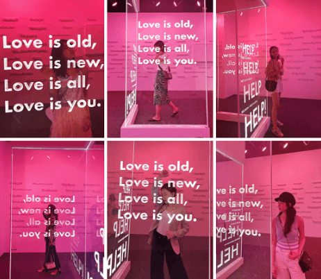 除此之外,展厅内还有梦幻的粉色打卡空间,一整面墙上都是披头士歌名浮雕,空气中还循环播放着披头士的4首经典歌曲,营造出时尚摄影棚的感觉。