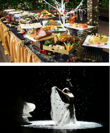 华丽炫彩的舞台;演绎童话的魔幻未来舞蹈,酷炫与之科技,不断刺激你的心脏;力量与唯美相结合太空漫步;优雅又夺目的梦幻芭蕾,似梦,似幻想,是最美感情宣泄,是精神的升华,是心灵的翱翔;热情激昂的桑巴舞,鼎沸的鼓声、狂放的舞姿、不停舞动的身躯,给你激情似火的感觉;创意沙画伴随歌手伴奏,声情并茂的勾勒出一幅充满童幻的沙画王国;优雅高贵的雀之灵,恰似童话世界的凤凰还巢,抖动羽毛,宛如仙境,带你领会对生命和人生的感悟、思索和追求;当晚将呈现一场前所未有的视觉盛宴。更有各式各样的时令鲜蔬,香甜可口的珍果宝馔,烤三文鱼配罗勒酱,蜜豆和樱桃番茄;各类鲜活海鲜拼盘;蜜汁烤火腿、烤新西兰羊排、烤澳洲谷饲牛柳、海鲜奶油芝士焗意面,圣诞节日面包布丁配焦糖白兰地沙司等;让你徜徉在浩瀚的美食海洋,感受味蕾上的饕餮盛宴。