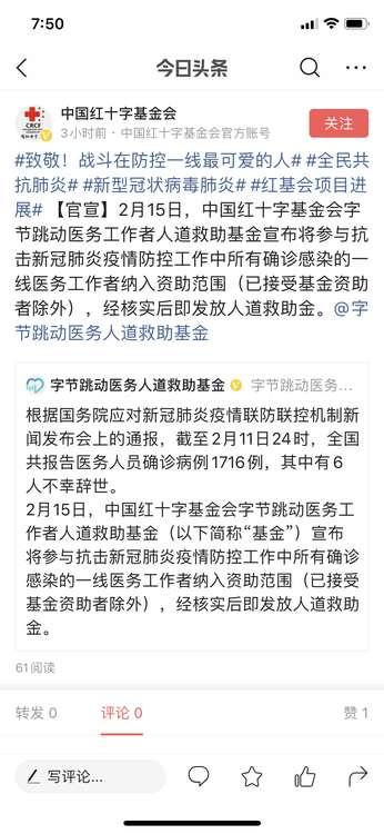 2月15日,中国红十字基金会字节跳动医务工作者人道救助基金(以下简称“基金”)宣布将这1716名感染确诊的医务工作者全部纳入到基金资助(已接受基金资助者除外),经核实后即发放人道救助金。