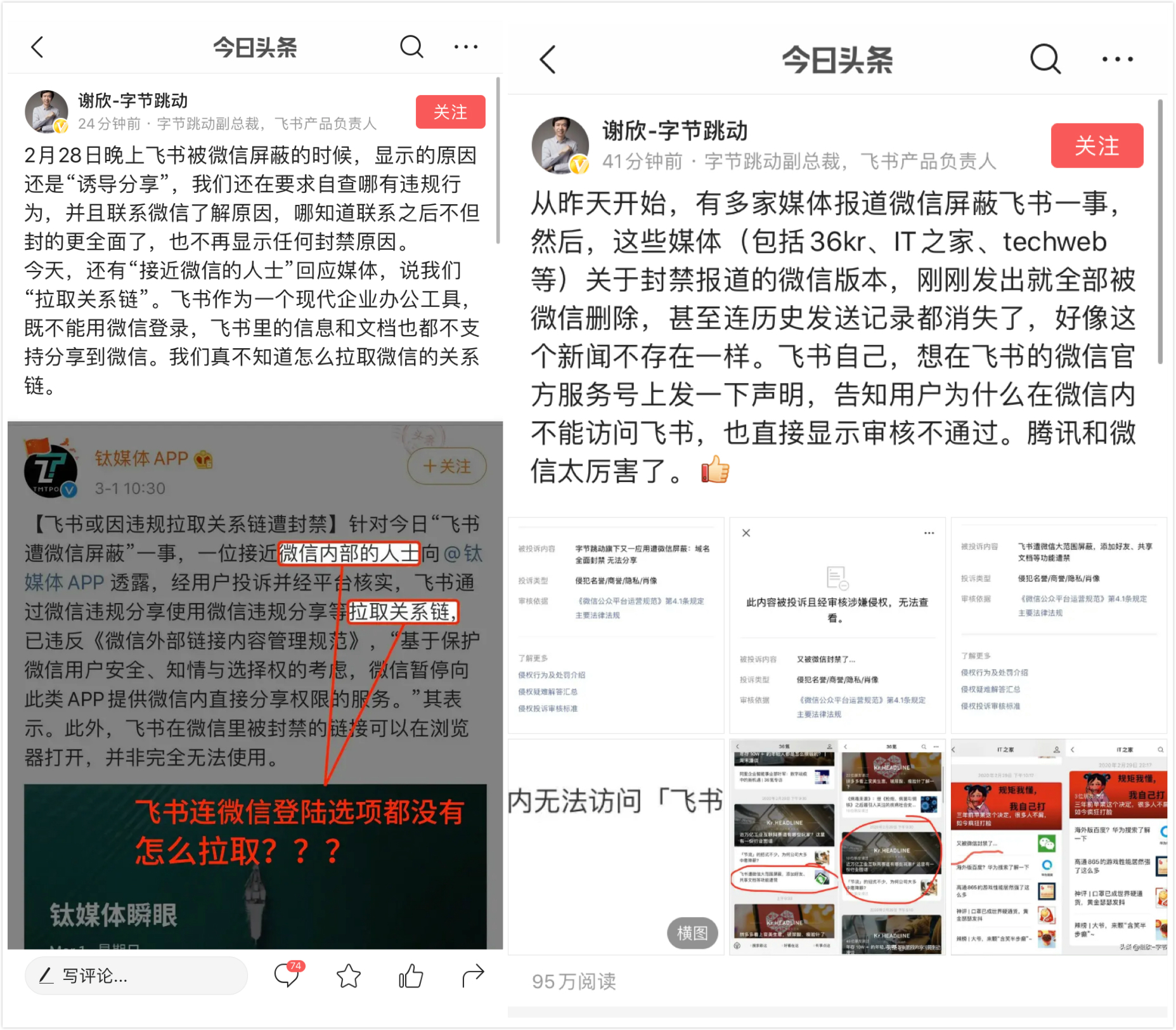 谢欣还在微头条里指出,多家媒体关于飞书被封禁的报道,在微信端都遭遇了删稿,飞书官方微信服务号也被做了限制,无法发出关于微信内不能正常访问飞书的相关说明,显示因“违反相关规定”审核失败。