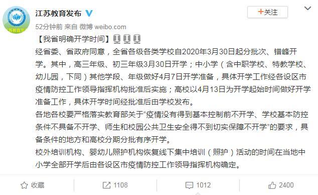 中新网3月21日电 据江苏省教育厅官方微博消息,江苏全省各级各类学校自2020年3月30日起分批次、错峰开学。其中,高三年级、初三年级3月30日开学;中小学(含中职学校、特教学校、幼儿园,下同)其他学段、年级做好4月7日开学准备,具体开学工作经各设区市疫情防控工作领导指挥机构批准后实施;高校以4月13日为开学起始时间做好开学准备工作,具体开学时间经批准后由学校发布。