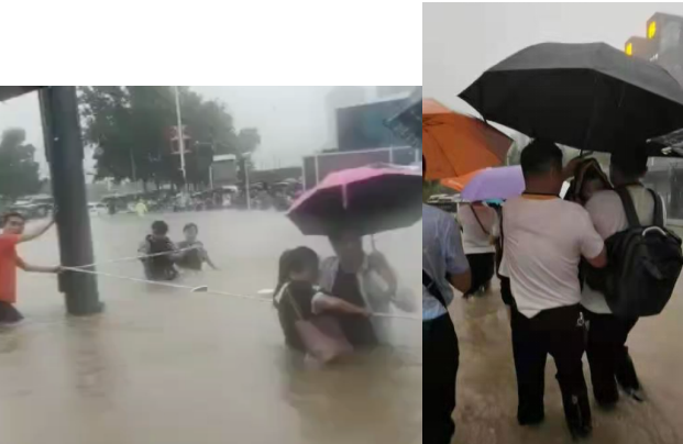7月20日,在郑州市地铁1号线民航路站口,因为积水已经漫进地铁站,群众开始撤离,阳光人寿河南分公司银保部韩宜衡看着孕妇及儿童在水中艰难前行,他心急如焚,赶忙找来绳子,沿着地铁入口拉起了“警示线”,协助行人安全顺利撤离。随后,阳光人寿商丘中支刘子琛、高博,也主动加入到护送孕妇及儿童的队伍中。他们两个人分工配合,一个人撑伞、一个人抱起孩子,来来回回,反复护送。近两小时的引导和护送,虽然全身湿透,但是他们的心却是火热的。
